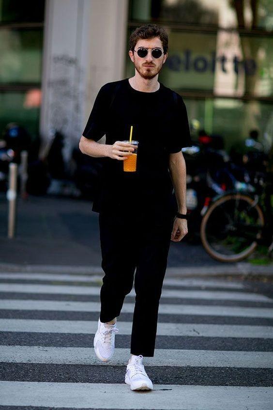 If you want to be restrained and low-key, you can choose a more “solid” cotton T-shirt paired with tapered suit pants. Pure cotton T-shirts are full of thickness, which greatly softens a person’s aura, while tapered suit pants often add pleats to the waist. Although the legs are modified without causing tightness in the buttocks, they still look simple and elegant.