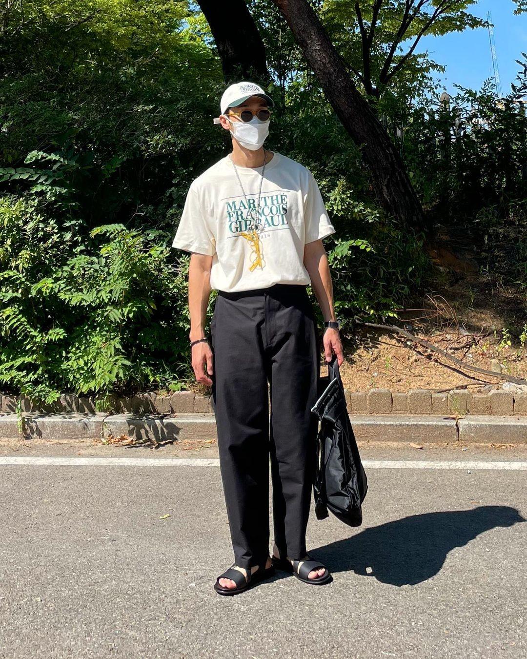 Sweatpants are very necessary in summer. First of all, the material is very comfortable and the upper body will not look stuffy. Secondly, the style is loose and not tight. They are light and convenient to wear. They are very worthy of choice for men who love sports. Pair a casual T-shirt with equally casual sweatpants. The top and bottom colors complement each other, creating a very cool and summery suit.