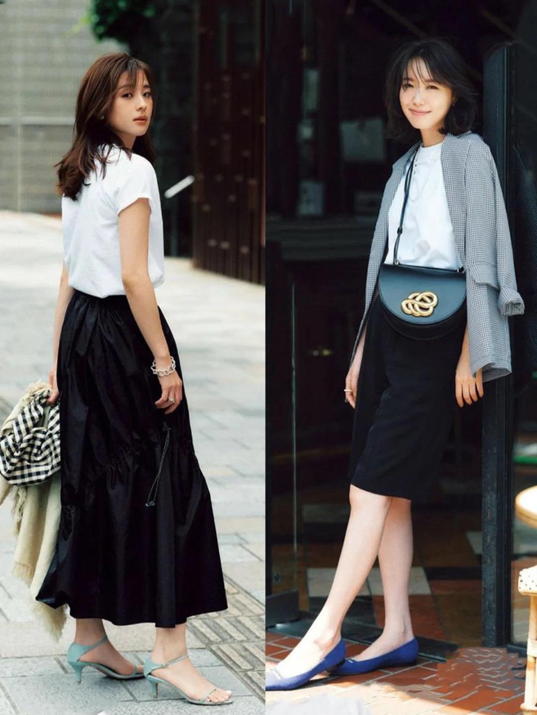 Knee-length skirts that cover the hips can be more charming and feminine. Women in their thirties and forties are in their prime, with plump and straight figures, and are particularly suitable for this kind of hip-hugging skirt, worn with a white T-shirt, which is refreshing and elegant.