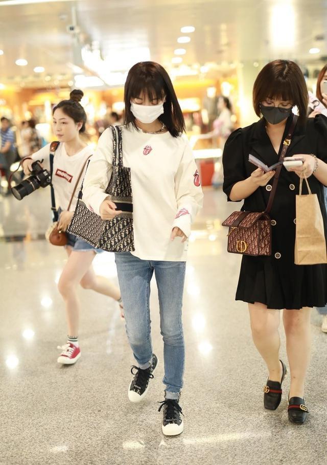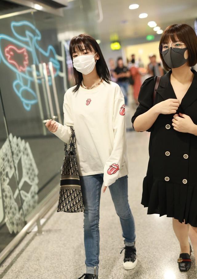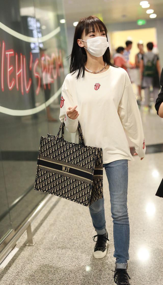 Although some places are in high temperature mode now, most places have still entered the Beginning of Autumn among the 24 solar terms. Although many people still choose short sleeves or skirts most of the time. But the long-sleeved T-shirt, a single item in early autumn, has also become a must-have fashion item for more and more people. Long-sleeved T-shirts not only provide a good concave shape in this season when the weather alternates between cold and warm, but they can also be layered with various short-sleeved shirts for a very fashionable effect. Long-sleeved T-shirts are not only loved by many fashion bloggers and trendsetters, but even celebrities cannot resist its charm. Recently, little girl Wu Jinyan wore a mask while walking to the airport. She wore a white long-sleeved T-shirt with jeans, and her bangs showed off her age.
