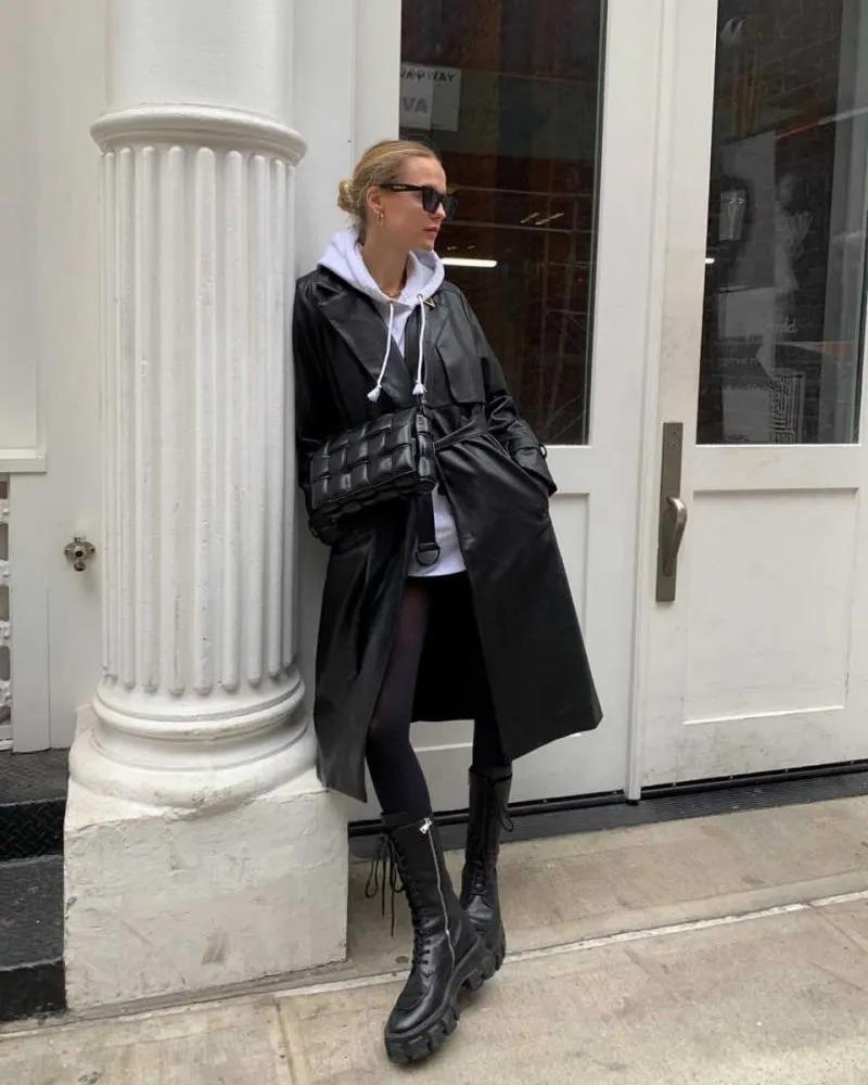 How to wear a hooded sweatshirt to look sexy and cute? This is coming. Choose a hip-length sweatshirt paired with classic black silk, then put on a long leather coat, put on a pair of tooth-shaped thick-soled Martin boots, and pair it with a soft leather black waist bag, which gives you a sense of well-behaved and uninhibited. , a perfect fusion of girl-next-door and bad-girl styles.