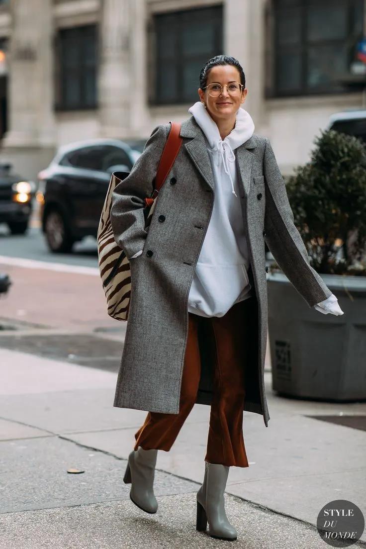 Compared with the round neck, the hooded one will have a stronger casual feel and the effect of reducing age will be better. . Of course, it will also be warmer. Just like this white model, its hood is also treated with a drawstring, which can be shaped and windproof with just one pull. The lower body is paired with burgundy cropped bootcut trousers and a dark gray long coat. The contrasting yet clean layers of bright colors are a typical American mix and match style.