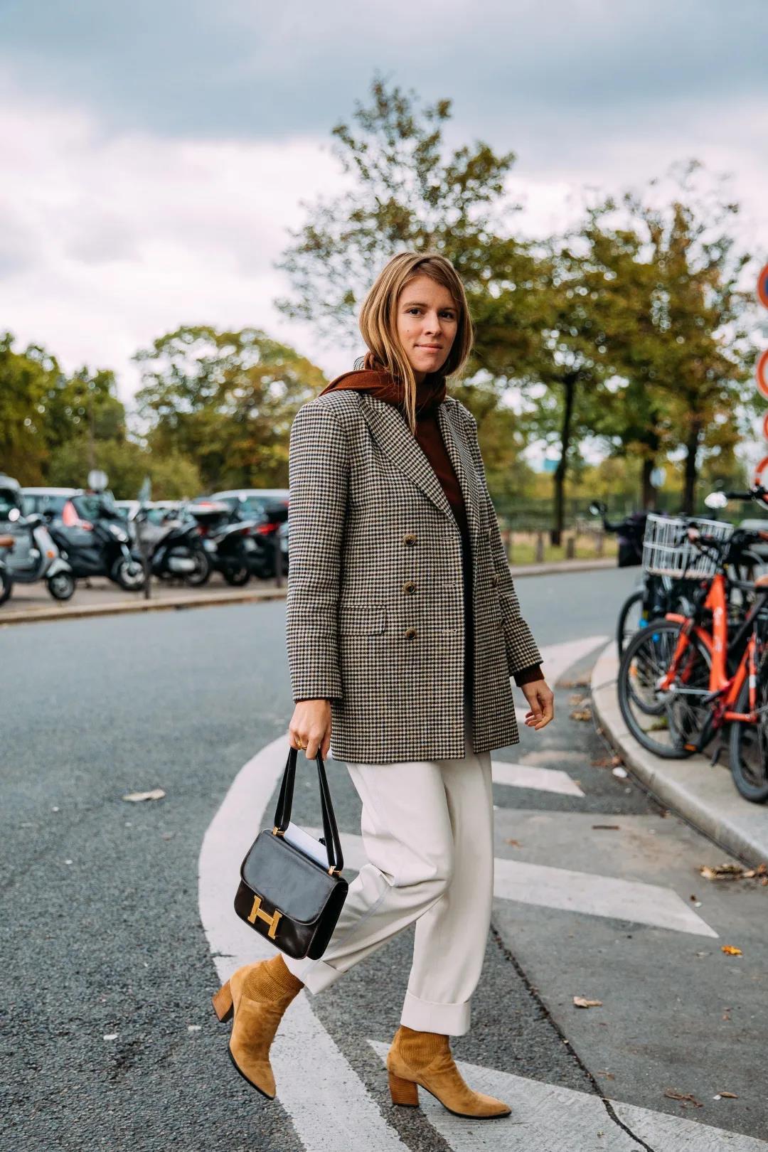 Have you ever tried matching a sweatshirt with a blazer? I believe there is a high probability that there is no such thing. Choose a round-neck short sweatshirt paired with white rolled-edge straight jeans to first create a casual street style frame, and then use a plaid casual suit to fill in the aura. In this way, American street and French street fashion can be broken apart and crushed together to create a unique personality and trend.