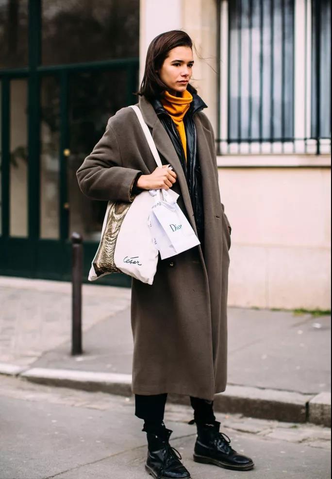 If the color saturation of the clothes is relatively high, then you must learn to layer them. Highly saturated and bright items are suitable for use as a base. For example, here, a ginger stand-collar sweatshirt is paired with a black leather jacket, topped with a dark brown coat, and paired with handsome black Martin boots. The cold and straightforward texture is very fascinating~