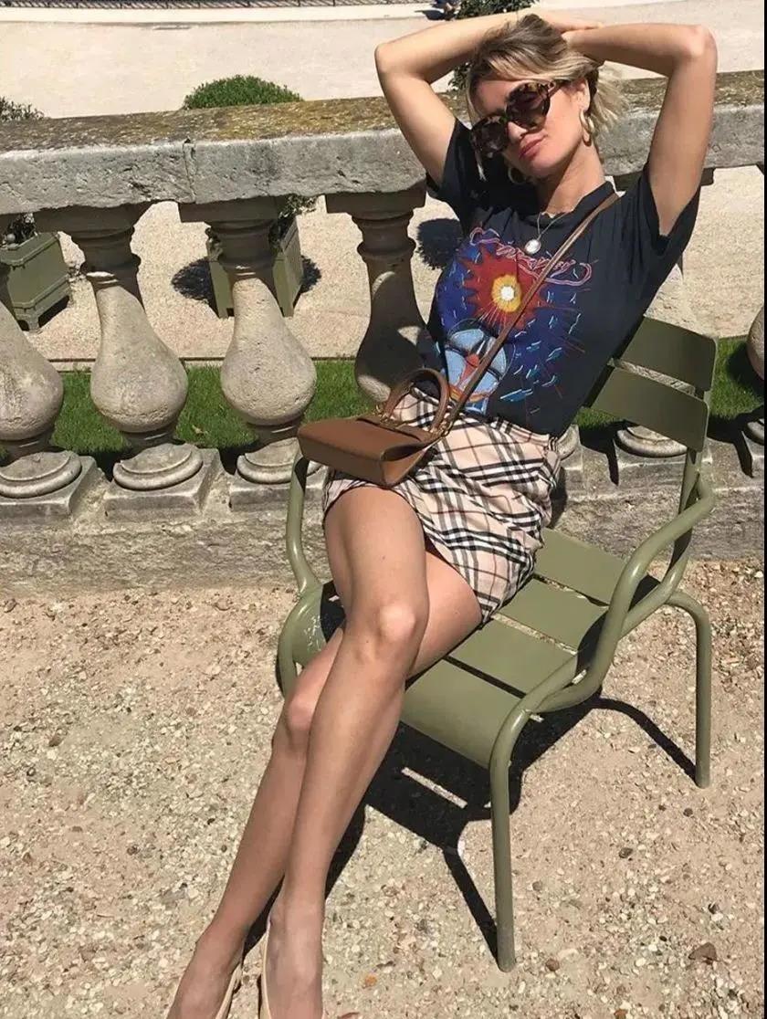Pair a bold printed T-shirt with a plaid high-waisted hip-covering skirt. First of all, in terms of temperament, it looks both age-reducing and sexy. And from an aesthetic point of view, a pair of long legs makes people envious, and at the same time it shows the superiority of the figure. Just wear it casually and you can become the center of attention of passers-by.