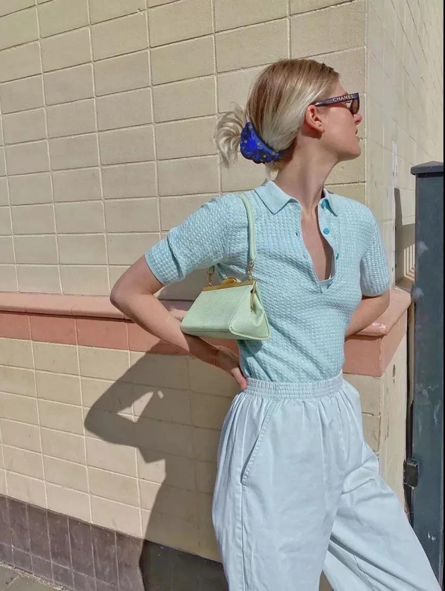 In comparison, it will be easier to wear blue of the same color, because blue itself is quite white. The upper body is a lake blue short-sleeved sweater, and the lower body is light blue elastic casual pants. The wearer looks very fresh and natural, and at the same time extremely relaxed.