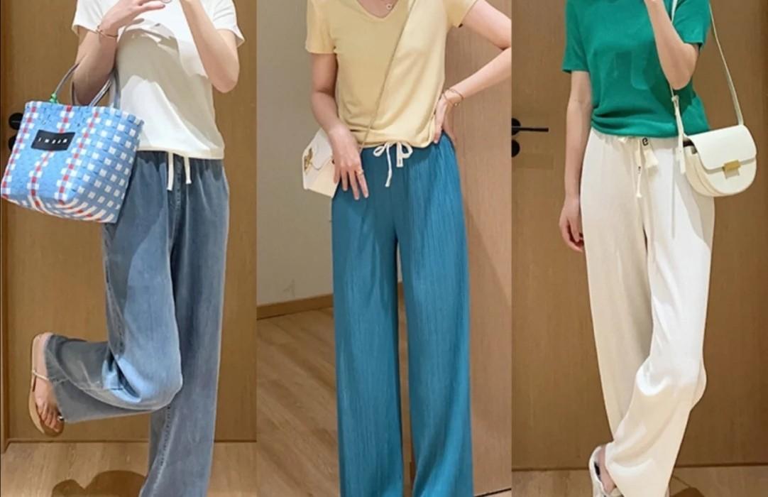 像这三款T恤,它们的颜色都各有不同,不过,搭配的都是垂坠感特别显著的宽松裤装,这是为了让腿型优化到极致,让身材比例也得到了修饰。