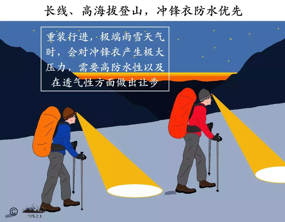 Long-term heavy-duty hiking and high-altitude mountaineering—such activities require carrying heavy-duty bags. In extreme rain and snow, the jacket may be soaked due to the pressure of the backpack. , thereby bringing about the risk of hypothermia. Therefore, such activities require jackets with high waterproofness and compromise on breathability, such as GORE-TEX Pro series products.