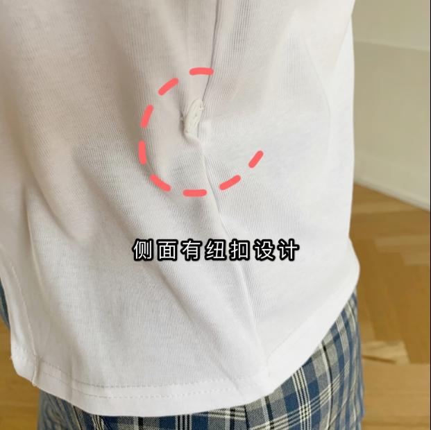 When you raise your hand, a part of your waist is exposed. The hem is designed with a small U letter hollowed out, and there are buttons on the side, so it achieves a waist-cinching two-wear design.