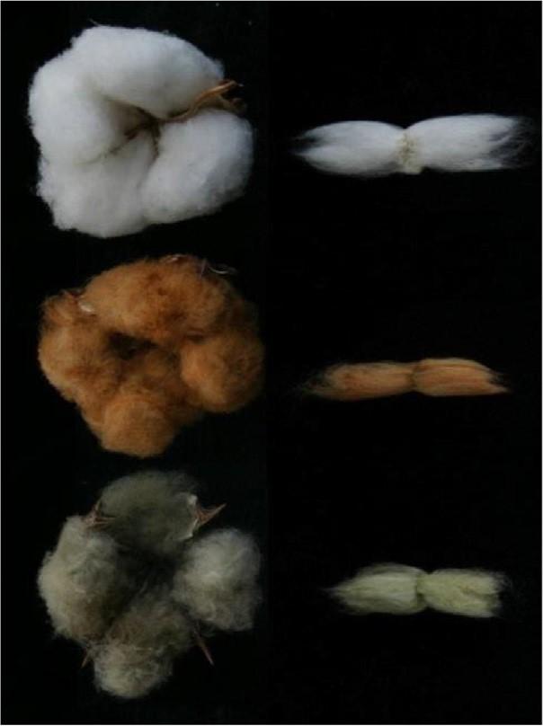Figure 1 White cotton, natural brown cotton and natural green cotton (picture provided by Professor Sun Jie of Shihezi University)