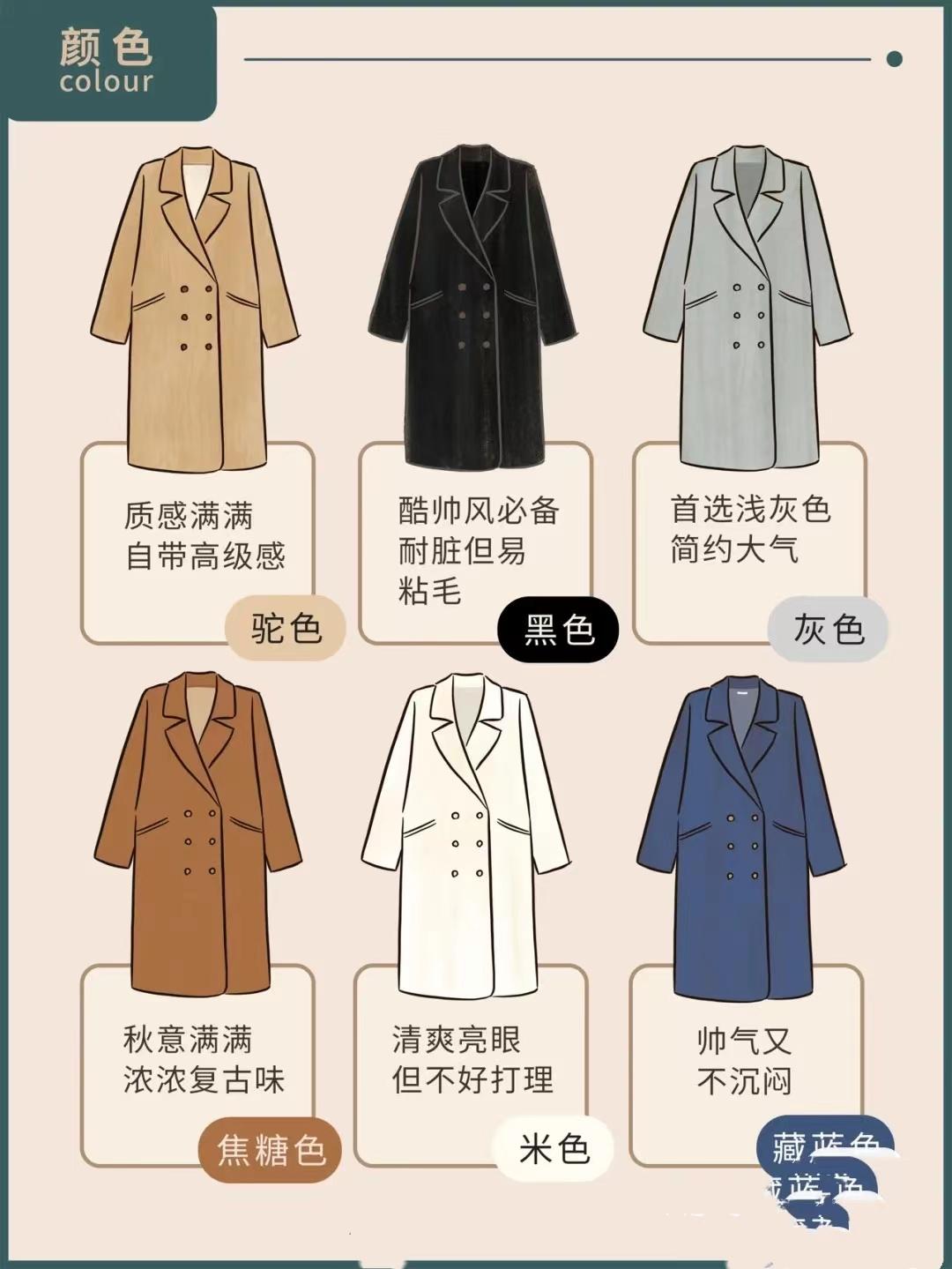 When choosing a coat, color cannot be ignored. Every color has its own emotion. The camel color is full of texture and is a coat with a high-end feel. The black color is cool, eye-catching, and extremely stain-resistant. It is simply a must-have for autumn and winter. Gray is simple and elegant, with high-end texture. Caramel color is a typical retro color with relatively high saturation. The beige color is refreshing and bright, with a gentle temperament. Navy blue is handsome and not boring, and the focus is on the special whiteness. When choosing a suitable coat, it is recommended that you choose more classic colors.