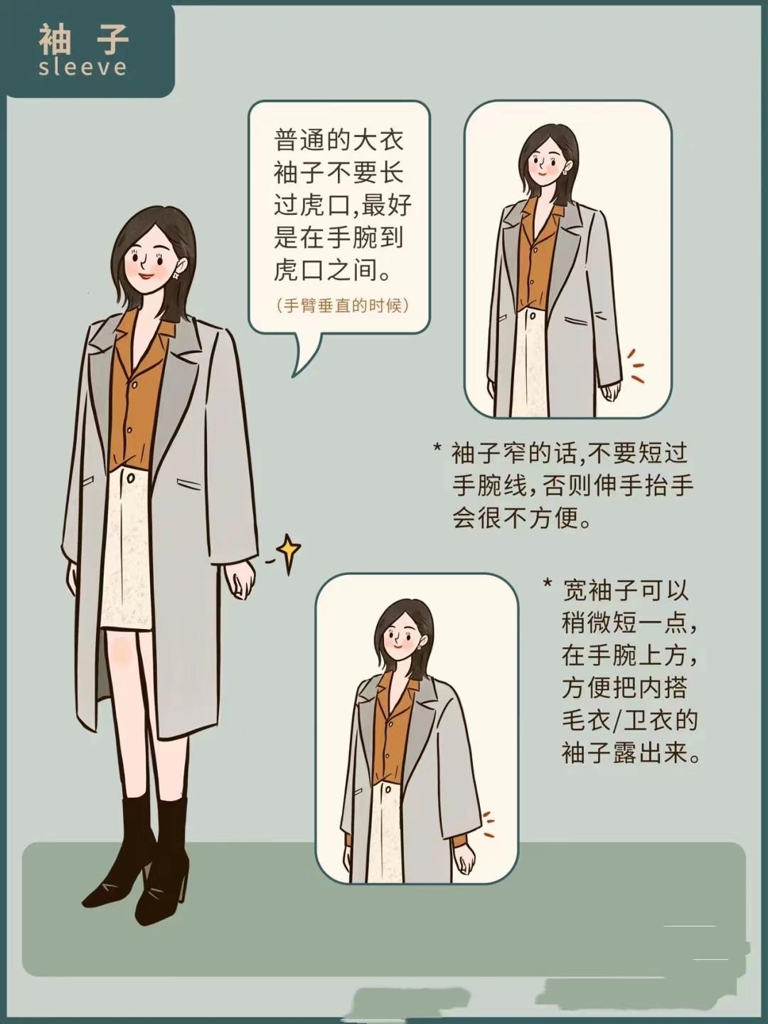 When choosing a coat, in order to maintain an elegant and neat beauty. The cuffs of ordinary coats should not exceed the tiger’s mouth. But if the sleeves are narrow, do not shorten them past the wrist line, otherwise it will be inconvenient to lift your hands. Wide sleeves are OK It should be appropriately shorter, just above the wrist. You can also expose the inner sleeves to create a nice layered look.