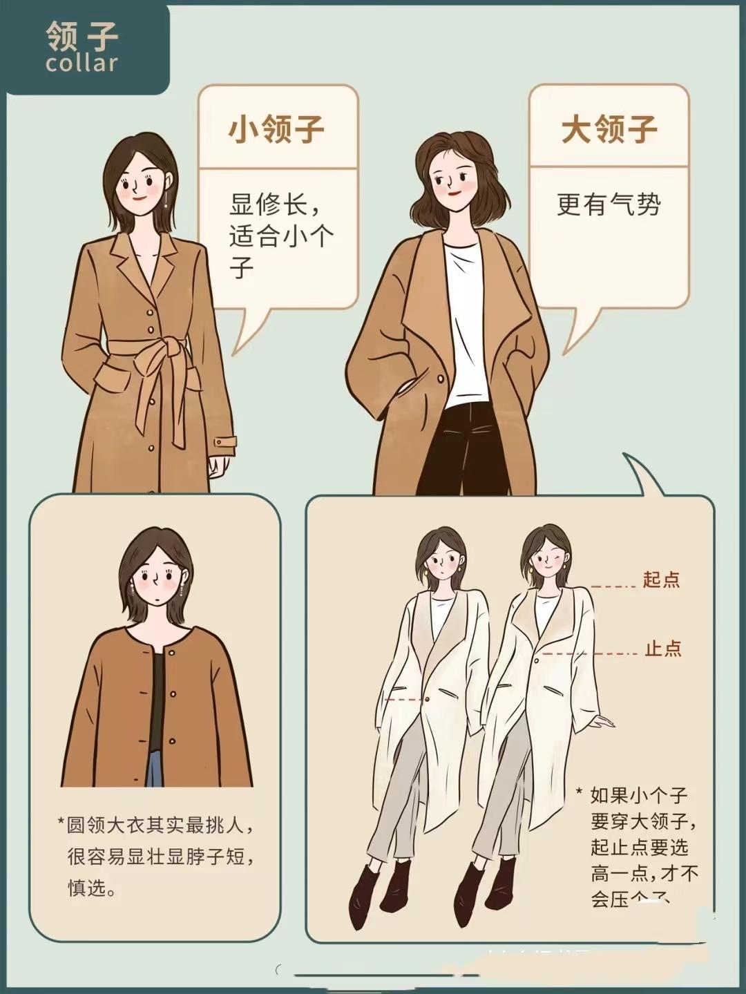 In a broad sense, coats can be divided into large collars and small collars. Small collars will It keeps you warmer and makes your figure appear slimmer without weighing you down. Big collars also have their own advantages, that is, they can easily show off a high-class and generous aura. If you are a petite girl, if you want to choose a big collar, you can choose starting point A slightly taller coat.