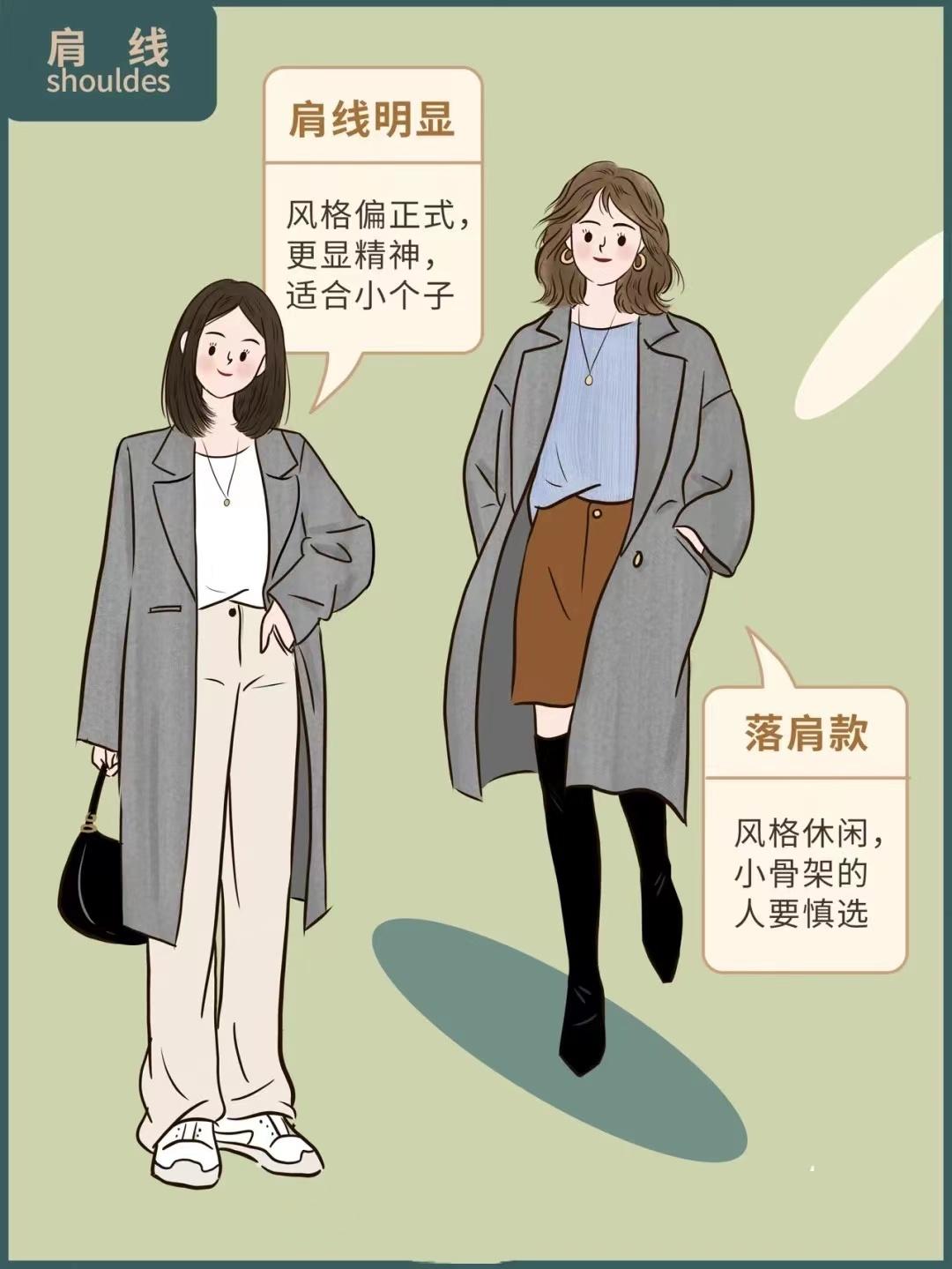 The design of shoulder line can generally be divided into two types. That is the obvious shoulder pad style, and the lazy dropped shoulder style. The shoulder-padded style is high-end and exquisite. It can be worn in commuting style to naturally enhance your aura. It makes you look taller and taller. It is suitable for small people to look energetic. The off-shoulder coat is lazy and casual, suitable for girls with big frames. A little girl’s upper body will feel like she is wearing adult clothes, making her figure appear more petite.