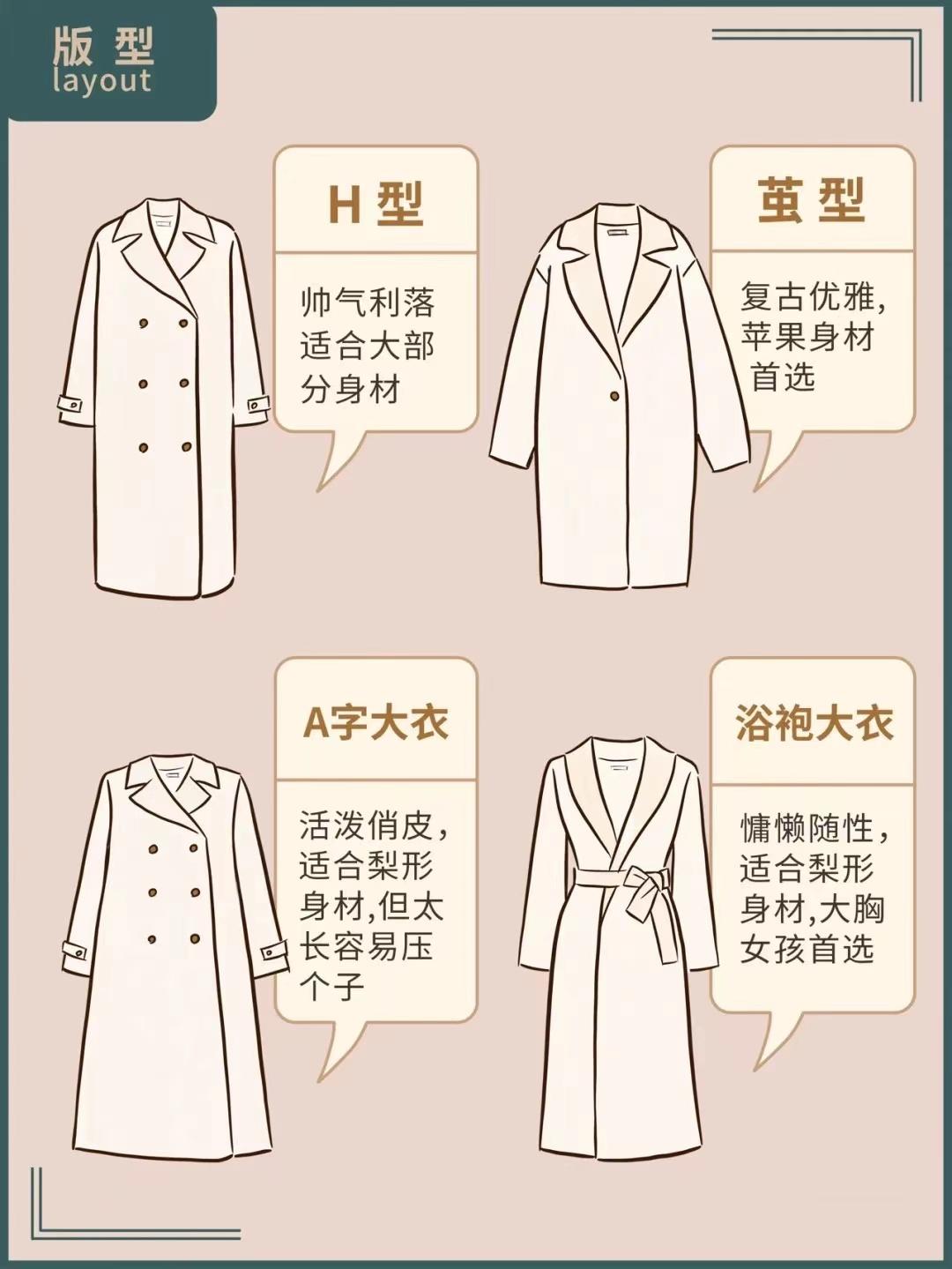 The styles of coats can generally be divided into four types. That is, H-shaped, cocoon-shaped, A-shaped, bathrobe-shaped. Of course, each version is not good or bad, each version has its own advantages and disadvantages. When choosing the style of a coat, you still have to refer to your own body shape.