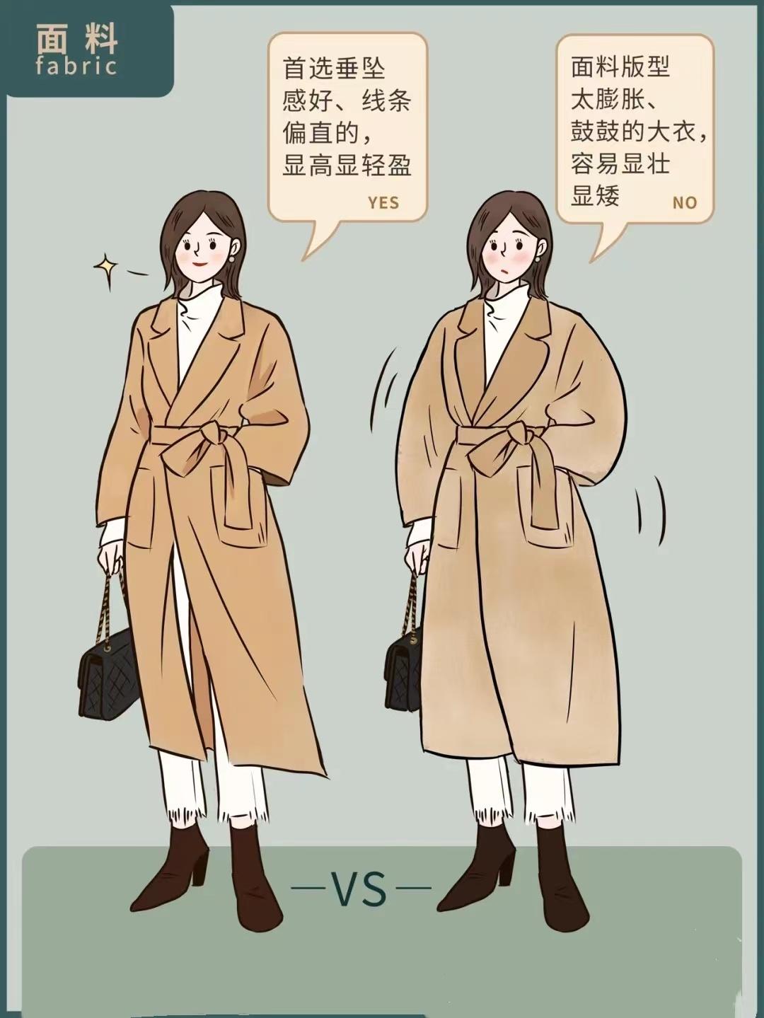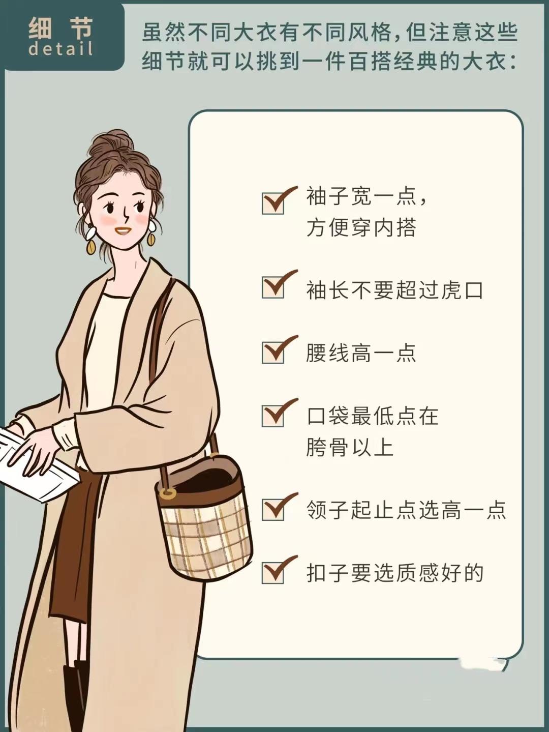 The choice of details cannot be ignored. When choosing a coat, try to make the sleeves of the coat wider, the waistline higher, and the collar The starting and ending points are a little higher. Also, the buttons of the coat should be chosen with better texture to show a more advanced taste.