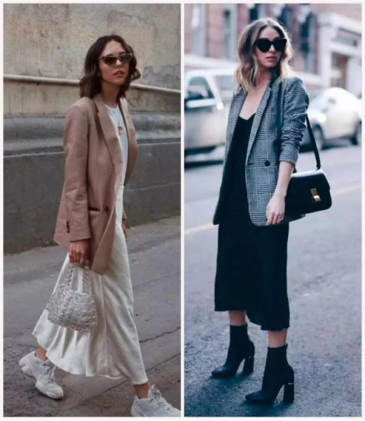 But pair it with a suit jacket and it will look much slimmer. The combination of the heroic suit jacket and the gentle and sexy satin dress , does it surprise you? The combination of a soft satin skirt and the toughness of a suit makes you more feminine. The transparent and light fabric of the satin dress looks very high-end and dynamic. When paired with a suit, it perfectly blends sensibility and rationality, and the effect is great!