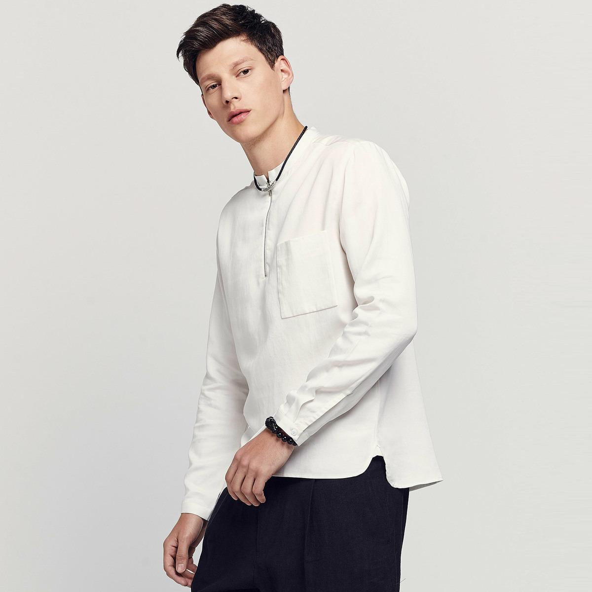 The friendly round neck and half-fly design with zipper decoration extend the personalized trendy decoration. The pleats and button cuffs of the cuffs harmonize the neat and tidy overall look. The curved hem line is less stiff and more casual.