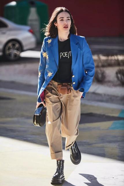 This year, the two crazes of sports style and retro style have returned to the fashion circle. As sports-style wide-leg pants, school uniform pants easily combine two popular elements. The school uniform pants with its own age-reducing effect, paired with a T-shirt, make the whole body look girly. If you want to look more feminine, you can wear a pair of small stiletto heels on your feet, which just balances the youthfulness and can make you look 10 centimeters taller.