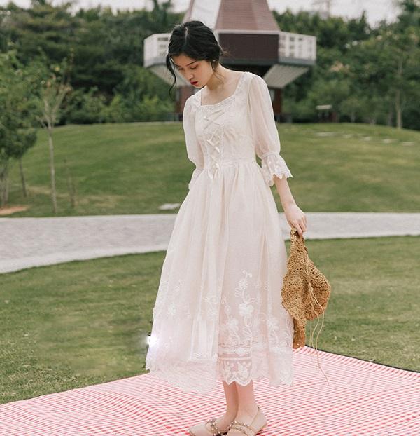 This white dress incorporates French style, which is gentle and retro. The back and front chest are designed with classic French laces, which is very literary and elegant. The cuffs of the sleeves are spliced with lace, which is full of forest style.