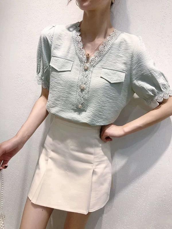 The same style also comes in mint green color. This color is very summery, and the deep V-neck design is a little sexy and cool. The color is matched with a light-colored skirt, which is very age-reducing and elegant.