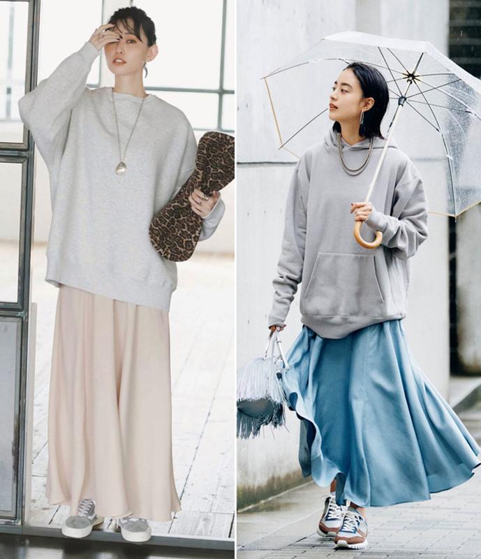 Gray circle Collar sweatshirt, the simple and elegant color is very versatile and shows your temperament, choose a loose styleThe style actually covers the flesh and makes you look slimmer. It has free and comfortable relaxation and feels very neutral. Pairing it with a soft satin skirt can add gentle femininity. The color of the skirt can be chosen in a similar elegant color, or in a light color. A blue satin skirt paired with a gray hooded sweatshirt is also a combination worth learning from. In short, the color matching should not be too jumpy, keeping it simple is the most beautiful.