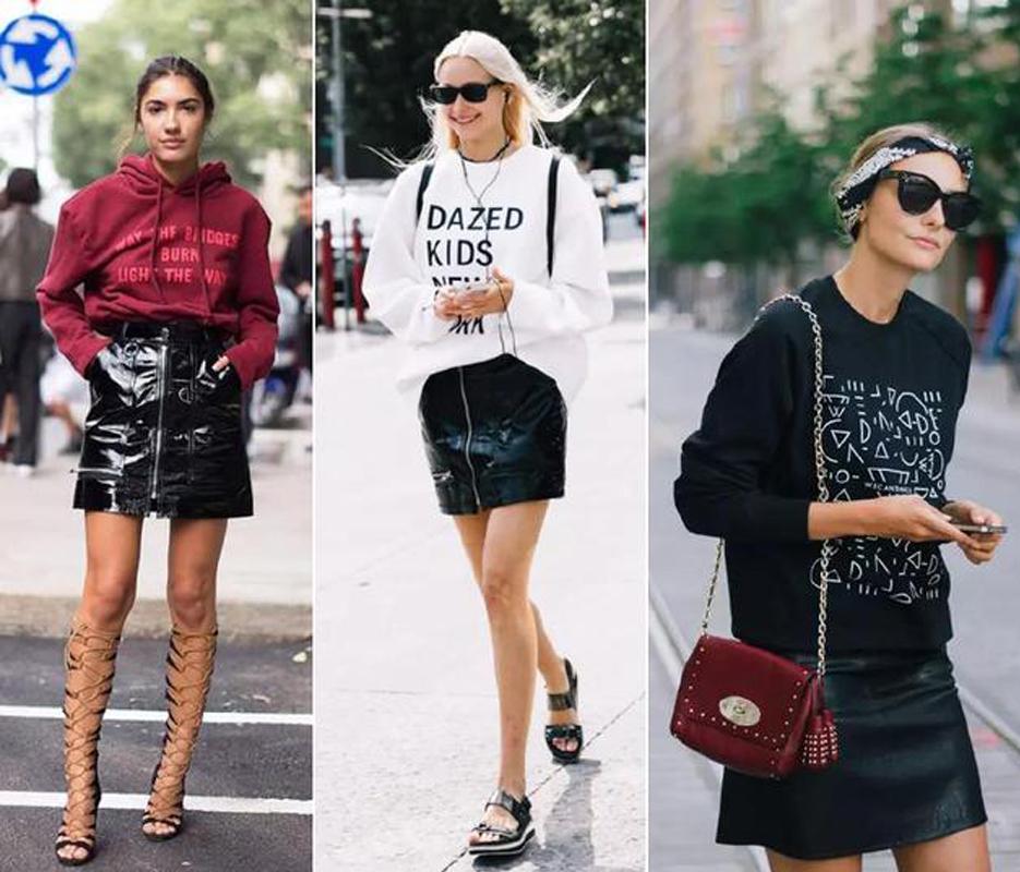 In addition to denim skirts, there are also more fashionable leather skirts, used to match letter styles and pattern styles. The sweatshirt has a cool rock and roll flavor. The gorgeous leather skirt and the casual feel of the sweatshirt form a very interesting contrast. The overall outfit is both street style and high-end, and the age-reducing effect is also perfect.