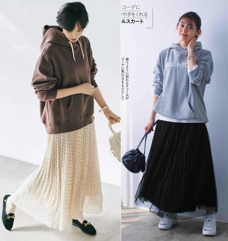 Light A dreamy tulle long skirt is most suitable for the romantic spring atmosphere. A soft tulle skirt paired with a loose hooded sweater can resolve the roughness and heavyness of the sweater and balance the overall style of the outfit.