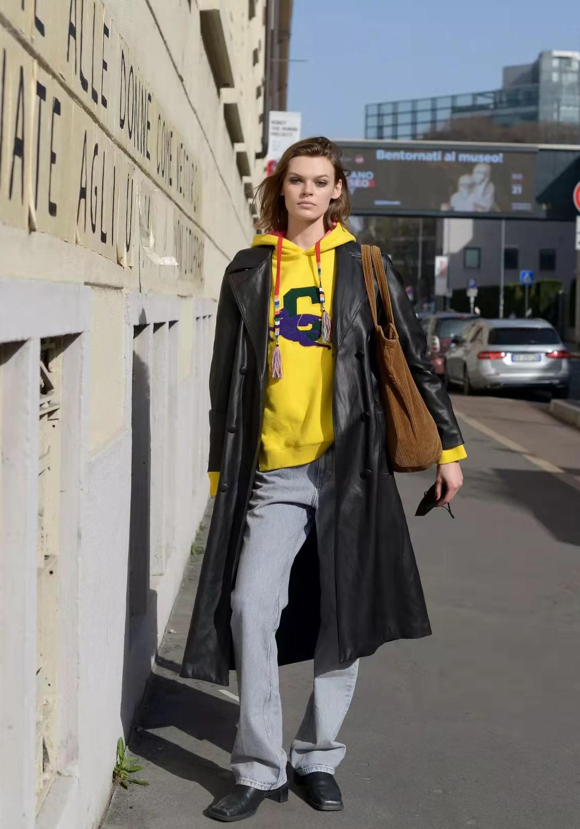 A black woolen coat or a leather coat is classic and versatile. If you want to get rid of mediocrity, you can wear it as an inner layer Choose a yellow hooded sweatshirt with a striking color, which can not only brighten the look well, but also inject a youthful and casual atmosphere into the entire outfit. Pair it with light-colored straight jeans. The style and sweatshirt echo each other, and the overall look is more elegant. Fashionable and age-reducing.