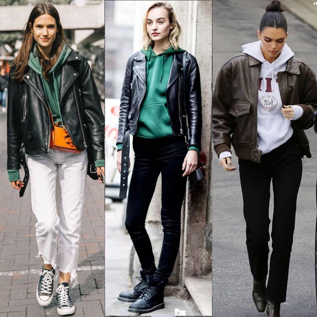 Motorcycle jackets are back again this spring Returning to the forefront of fashion, if you want to bring out its handsome charm even more, you might as well use a sweatshirt as an inner layer. The green hooded sweatshirt is paired with a black motorcycle jacket. The color combination is very nice and has a retro atmosphere. Pair it with slim-fitting white jeans or black leggings, plus classic canvas shoes or short boots, and you can look absolutely trendy. character.
