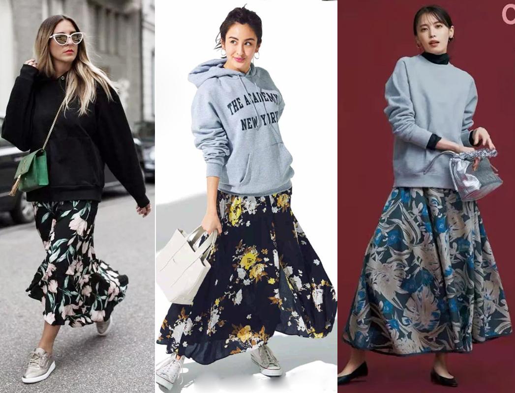 Monochrome black, white, and gray sweatshirts, More versatile and practical in autumn. If you want to break the monotony of a single-color sweater and resolve the neutral style of the sweater, you can pair it with a dark printed skirt. A simple and complex combination can not only break the monotony and dullness, but also create a romantic and elegant feeling. , making your autumn outfit both handsome and free-spirited, yet elegant and feminine. As for the pattern of the skirt, it is recommended to avoid too fine floral prints and choose large floral prints, which will look more elegant and generous.