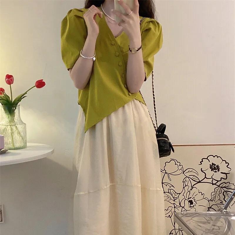 ● This yellow-green piece has quite a few design points, including retro puff sleeves, diagonal placket, and uneven hem. Regular triangles, etc., have a sense of design and have a retro feel!