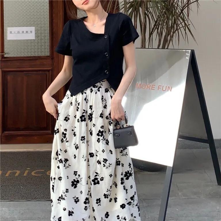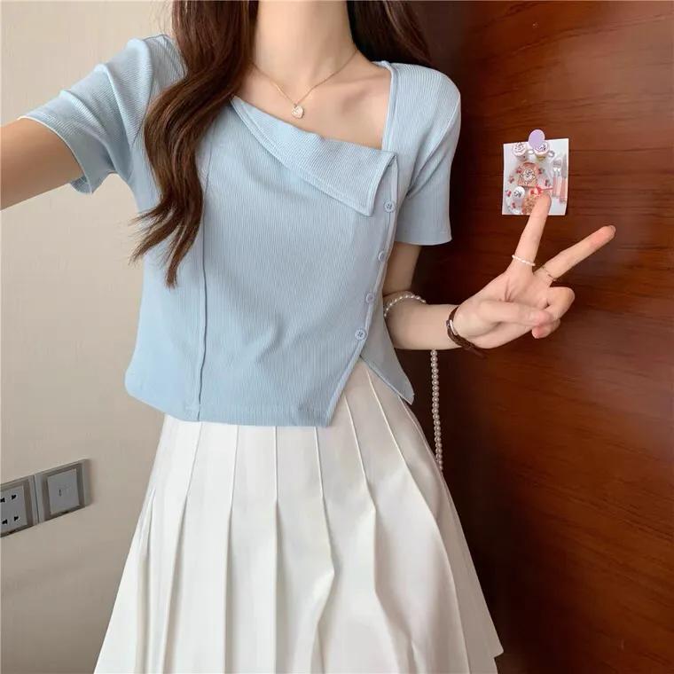 ● Black T-shirts are very common, but this button-down one with a diagonal placket is a bit special, with both the collar and hem It is irregular, simple but with some small designs!