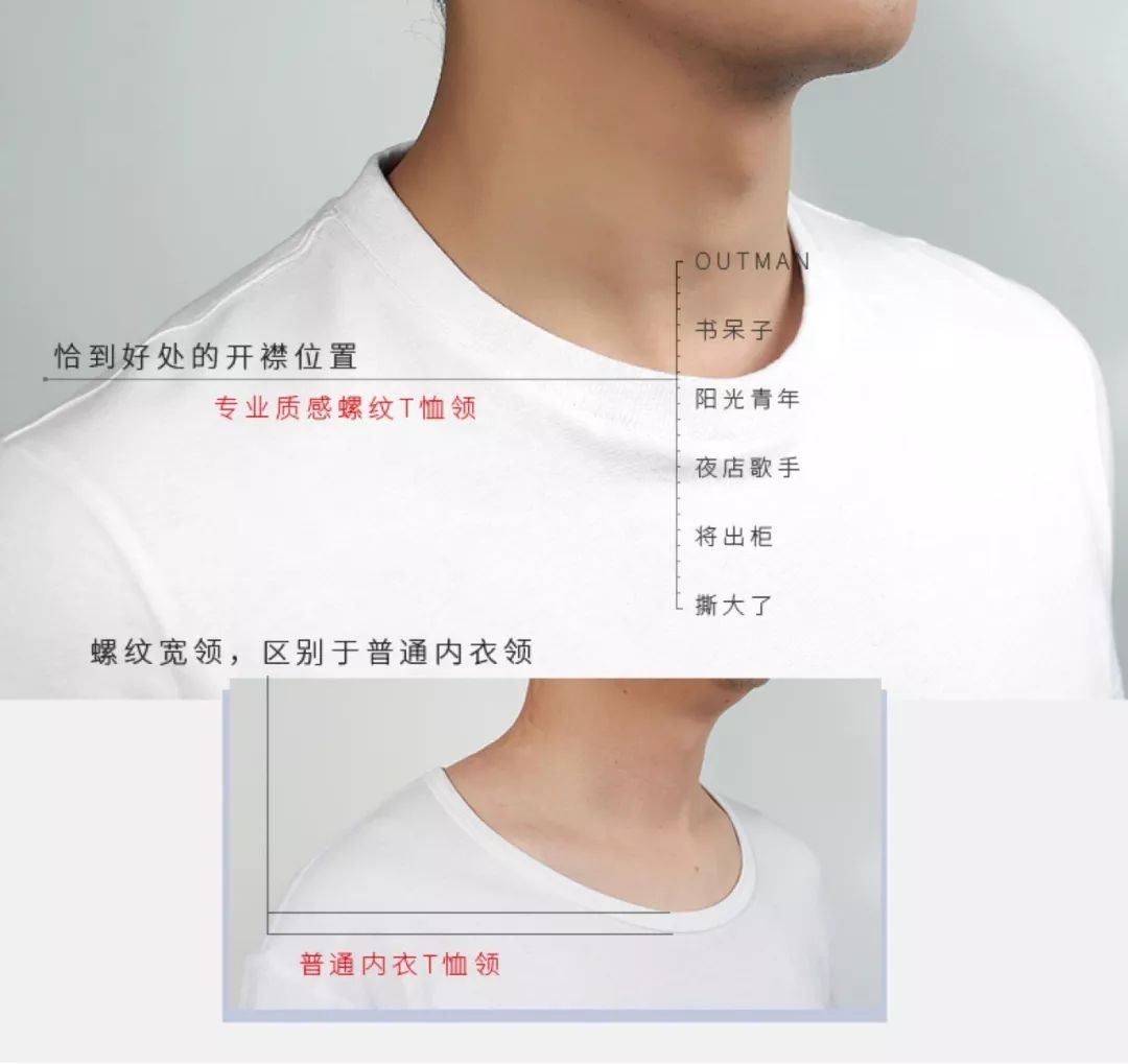 The neckline of a round-neck T-shirt should not be too big, just moderate, and do not expose a large part of the collarbone.