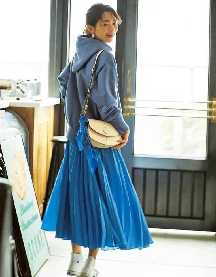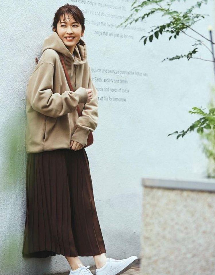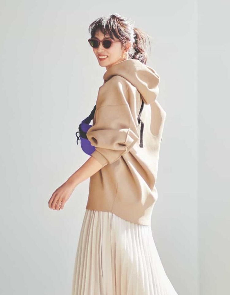 Sweatshirts have their own fashion attributes and age-reducing effect. If paired with a skirt, they will retain their femininity while weakening the age sense of the overall outfit. Up and down Keep the colors solid but different, and use color to distinguish the proportions of the upper and lower body.