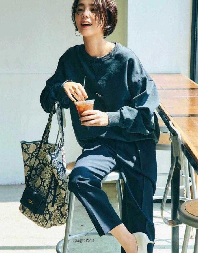 If you have a straight body shape, you can wear a sweatshirt with cigarette pants to use the advantages of the clothing pattern to strengthen the body lines and achieve the effect of making you appear taller and slimmer.