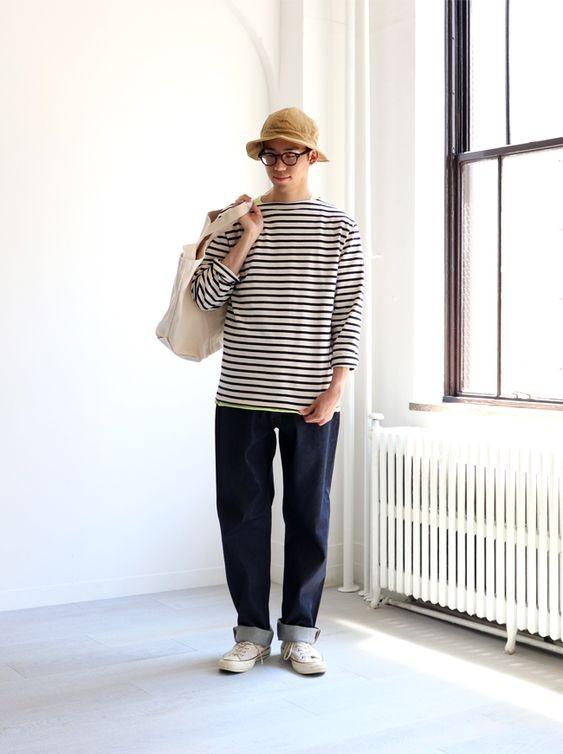 Jeans are a must-have for trendy men. Pair them with a loose striped T-shirt, which can just make up for the shortcomings of jeans. Blue jeans tend to make the upper body look fatter, so pairing them with a longer and wider striped T-shirt not only covers the lower body well, but also allows for freedom of styling, making it casual, simple and low-key.