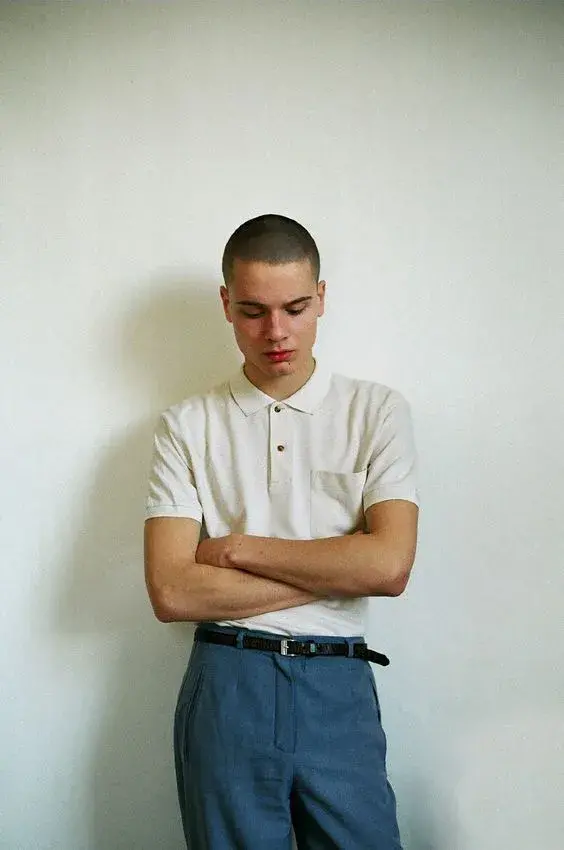 The next issue is the face shape. Many boys want to wear straight-line clothing in order to neutralize the curves of their appearance, just like The outline of the facial bones is not obvious, there are too many soft tissues, and the face is not strong enough. Then we can unbutton a button of the Polo shirt to form a straight V shape at the neckline, which can also save the face that is too fleshy. .