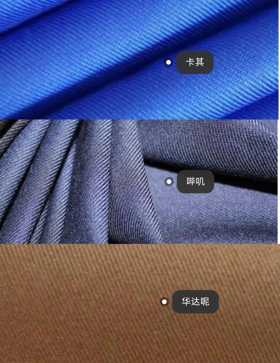 :Gabardine: also known as gabardine, The texture is clear and the texture is thick. Stiff but not hard, the fabric surface is shiny, wear-resistant without breaking, suitable for spring, autumn and winter uniforms, windbreakers, jackets, etc.