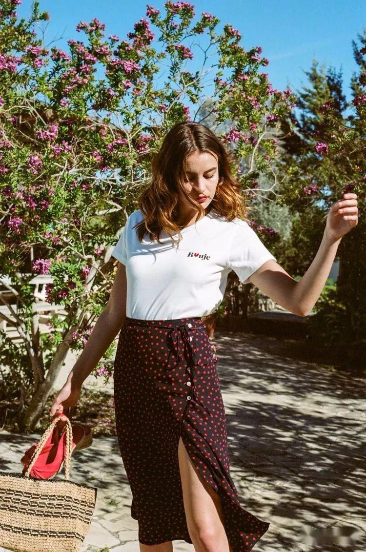 Except for the sweet ones Skirts with small floral elements. Girls who love beauty can also try polka-dot skirts. If you have a pear-shaped figure with a thicker lower body, then you might as well try a dark-colored polka-dot skirt with a white T-shirt, with a light top The deep color matching method has a good effect on modifying the shape of the legs, allowing you to easily wear it to look good.