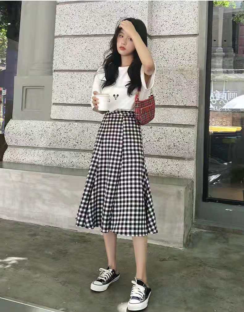 Clean pure white The shirt has a small and loose fit, which makes you look slim when worn, giving it a casual and lazy feel. The cute Mickey Mouse print adds some fun and avoids a monotonous atmosphere. The lower body is paired with a trendy black and white plaid skirt. The high-waisted and large skirt is very flattering to the figure. The fishtail skirt design is very lively and playful.