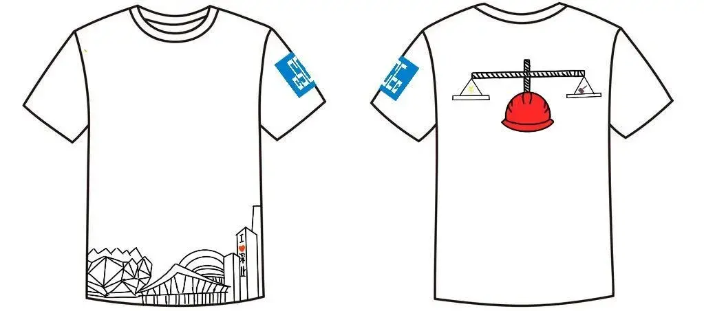 On the front of the T-shirt, the landmark buildings built by the company are used to depict the development history of the Eighth Bureau South. The blank part symbolizes the infinite possibilities of the company’s development, waiting for new people to fill it. On the back of the T-shirt is a scale pattern made of three elements: steel bars, cement, and safety helmets. The orange money sign on the left represents our legal income under the sun, and the gavel on the right represents governing enterprises according to law. This is not only a topic faced every day in the work of the commercial law system, but also a common value of the eight bureaus.