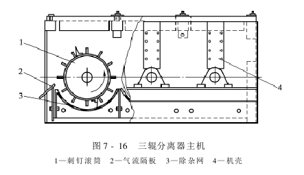 The structure of the main machine of the three-roller separator is shown in Figure 7-16. It is mainly composed of a casing, a spike roller, an impurity removal net, an air flow partition, etc.
