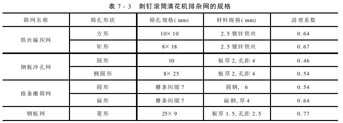 The screen hole specifications and corresponding cleaning coefficients of various impurity removal screens are shown in Table 7-3.