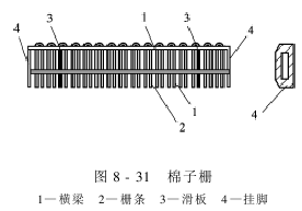 Cotton grid is composed of beams and bars.As shown in Figure 8-31. The cross beams are two 25mm wide flat steels with equidistant holes drilled on them. The diameter of the holes is determined according to the thickness of the steel wire. The steel wires are inserted into the cross beam holes and riveted tightly to prevent the bars from loosening and are evenly arranged on the two cross beams. The clear distance between the grids should be larger than the cotton waist diameter, generally around 7.5mm. There are two flat steels on the grid surface, which are push board runways (or skateboards). Thin steel plate hanging feet are installed at both ends of the cotton grid. There are rectangular holes on the hanging feet to adjust the position of the cotton grid and be fixed on the rack wall plate with screws.