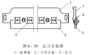 The front transverse plate is made of pig iron, and its two ends are fixed to the upper parts of the left and right wall panels with bolts as the cross beams of the rack. A straight step groove with the same thickness as the fixed knife is milled out on the lower end of the plate to install the fixed knife. A number of holes are arranged horizontally on the upper part of the front transverse plate at regular intervals for use when installing the arcuate pressure plate. The fixed knife is clamped between the front horizontal plate and the bow pressure plate. By adjusting the bolts of the bow pressure plate, the pressure of the fixed knife on the top roller can be adjusted. The installation diagram of the fixed knife is shown in Figure 8-29.