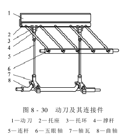 The movable knife is also made of low carbon steel plate, with a width of 90~95mm and a thickness of 3~4mm. The movable knife and its connecting parts are shown in Figure 8-30. The back of the movable knife is riveted on the bracket. Five round holes are evenly opened on the side of the bracket. One end of the five struts is inserted into the round hole of the bracket. And fix it with bolts. The other end is threaded, penetrates into the five-eye shaft of rectangular cross section, and tightens with nuts. Both ends of the five-eye shaft are fixed on the wall panels on both sides. The lower end of the bracket is equipped with a supporting ring loop, through which the connecting rod is connected.