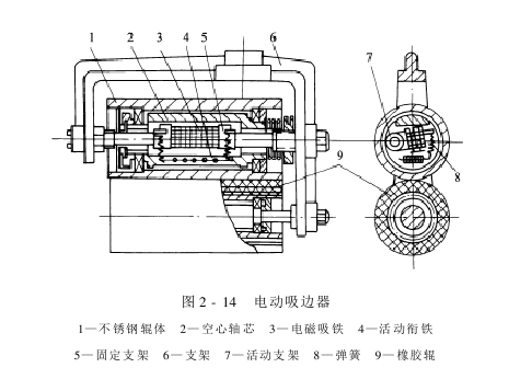 Figure 2-14 shows an electric edge suction device that is currently widely used in China. Its pair of pressure rollers consists of a stainless steel roller and a rubber roller. The stainless steel roller is equipped with a fixed electromagnetic magnet and a movable armature. A spring is installed between the suction iron and the armature, the fixed suction iron is installed on the bracket, and the movable armature is connected to the stainless steel roller body. When the fabric is running normally, the space between the two rollers is pressurized by the suction spring, and the suction forces on both sides of the open-width fabric are equal. When the fabric is deflected, it touches the contact rod, and the operating element is used to make the suction iron work, overcome the spring pressure, release the pair of pressure rollers and release the pressure, and the fabric moves back to the other side, thereby correcting the deflection.