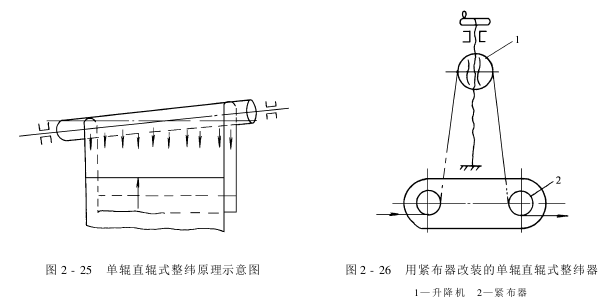 Carefully analyzing the changes in warp tension of the fabric throughout the width can further understand the physical process of weft adjustment. When the weft straightening roller is placed horizontally, that is, parallel to the weft direction of the fabric, the warp tension is evenly distributed throughout the fabric, and the relative running speed of each warp yarn is also consistent; when the weft straightening roller is skewed, such as the right end is higher than the left end , the warp tension of the fabric decreases from right to left, as shown in Figure 2-25. The friction resistance between the fabric and the roller surface also decreases in the same way. As a result, the running speed of the fabric warp increases from right to left, that is, the warp speed at the left end of the weft straightening roller is high and the speed at the right end is low. The right end of the weft yarn that intersects with the warp yarn will slow down and the left end will speed up. In this way, the left rear straight line latitude is corrected. Figure 2-26 is a single-roller straight-roller weft straightener modified with a fabric tensioner. It has a simple structure and good effect, but it can only adjust the straight line latitude and skew within 3°.