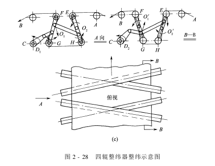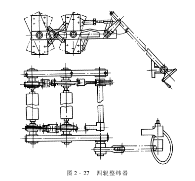 The four-roller weft straightener shown in Figure 2-27 is a commonly used one in China. It is mainly composed of four weft straightening rollers and an adjusting mechanism. Each weft-setting roller is connected by double-row radial spherical ball bearings and two sets of connecting rods.
